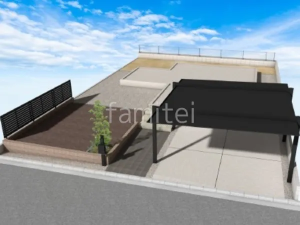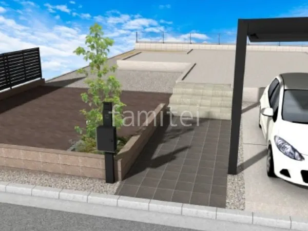 300角タイル LIXIL パセオを使用したタイルアプローチは、重厚感と高級感を演出します。 駐車スペースには2台用カーポート LIXIL カーポートSCを採用し、フラットでシャープなデザインで車を雨風から保護します。 お庭スペースにはシンボルツリーを配置し、季節の変化を楽しめる癒しの空間に。 敷地境界には目隠しフェンス LIXIL AB YS3型を設置し、プライバシーをしっかりと確保しました。